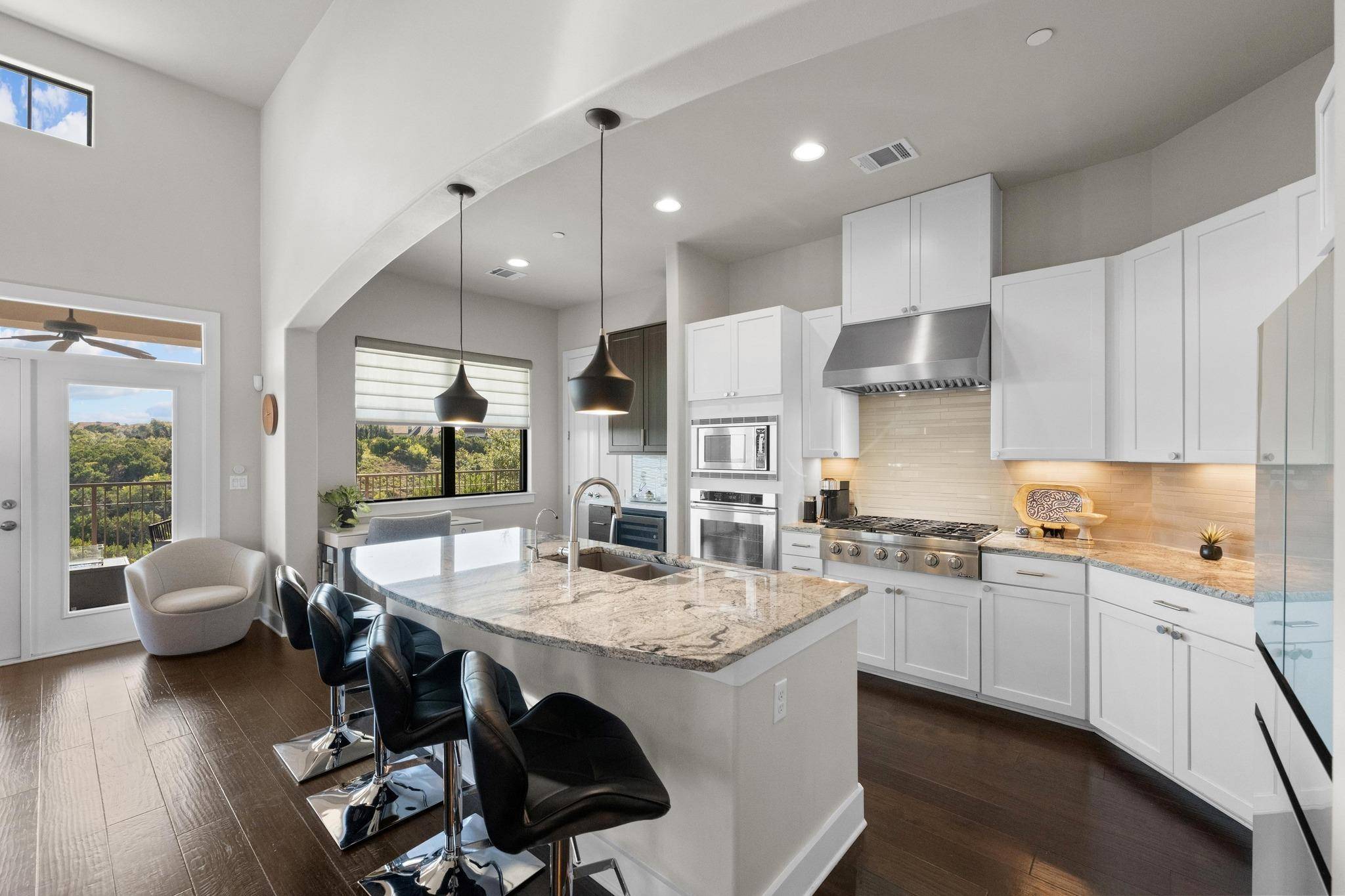 Experience elevated Hill Country living in this stunning multi-level residence at The Enclave at Escondera. Offering 3 bedrooms, 3 full baths, and 3,316 sq ft of thoughtfully designed space, this home blends luxury, comfort, and a true lock-and-leave lifestyle just minutes from downtown Austin. The open main level welcomes you with high ceilings, engineered wood floors, and walls of windows framing beautiful Hill Country views. The gourmet kitchen features sleek Dacor stainless-steel appliances, a wine refrigerator, and a large island that flows seamlessly into the spacious family room—perfect for entertaining. This level also includes an elegant office, a secondary bedroom, and a full bath, offering flexibility for guests or multi-generational living. Downstairs, you'll find a generous living area with a kitchenette—complete with sink, full-size refrigerator space, and large island—plus a guest suite featuring an en-suite bath, cozy fireplace, and access to a serene patio. The outdoor space is fully turfed and includes a private putting green, ideal for relaxing or entertaining. Enjoy Hill Country and greenbelt views from both the main-level balcony and the expansive rooftop deck. Automated shades, abundant natural light, and a 2-car garage enhance the home's ease and sophistication. The gated community offers a fitness center near the entrance and a walking trail that leads to the resort-style pool. Conveniently located near Lantana Place, enjoy upscale amenities including Moviehouse & Eatery, Carve American Grille, Black Rock Coffee, and boutique shops and services—all just moments away. Discover refined Hill Country tranquility paired with city convenience in this exceptional Enclave at Escondera home.